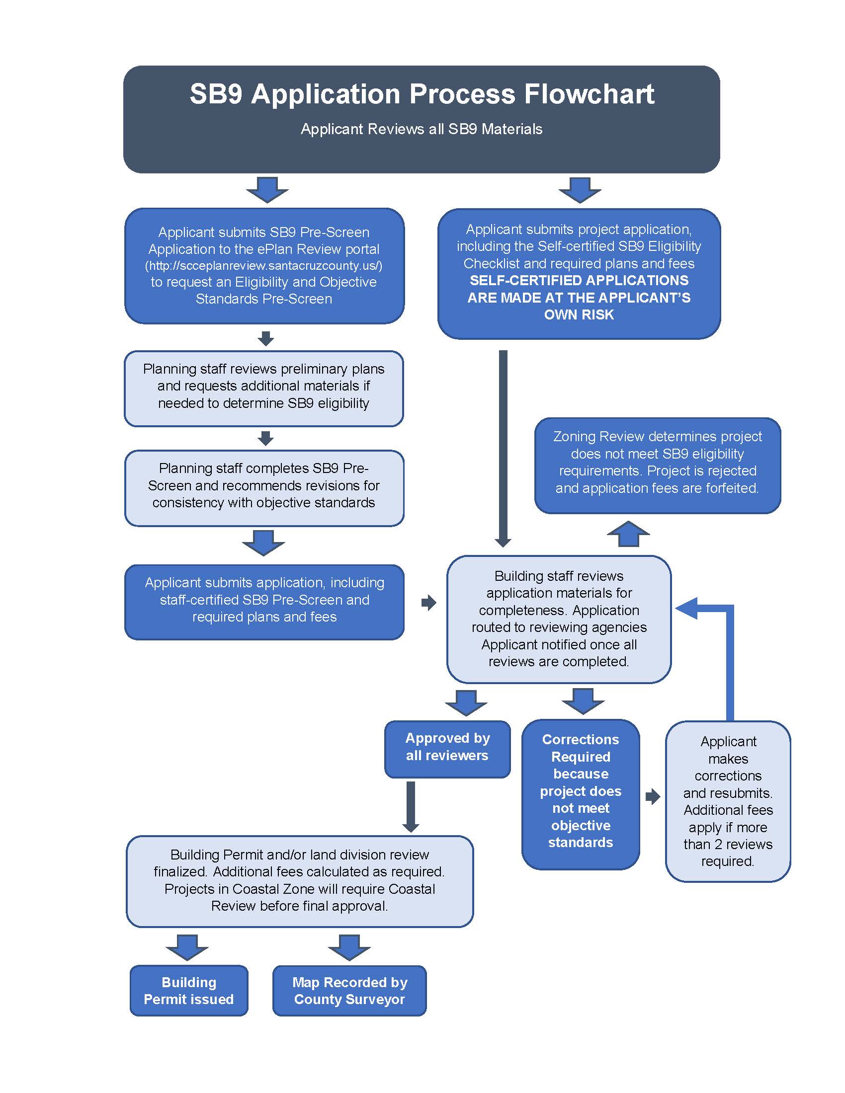 Projects obtaining an Eligibility and Objective Standards Pre-Screen completed by County Planning staff will help insure that your project is correctly prepared for submittal. Self-certified applications are made at the applicant’s own risk. If a proposed project does meet state eligibility standards, project review fees will not be refunded, and additional fees may apply. See the SB 9 Application Process Flowchart for more details.